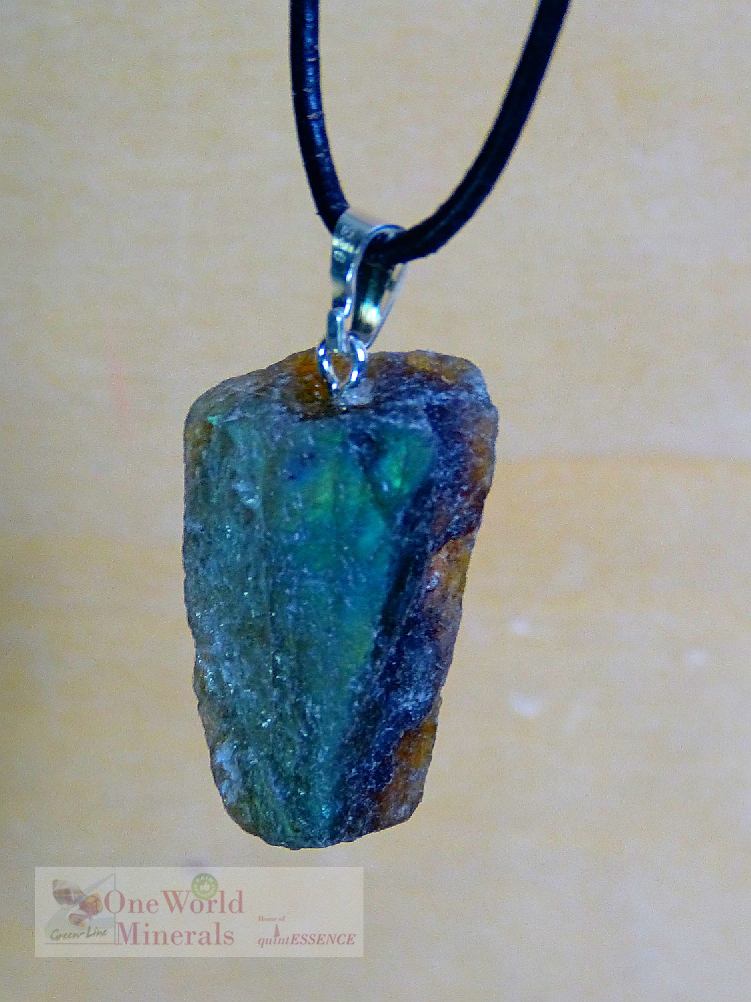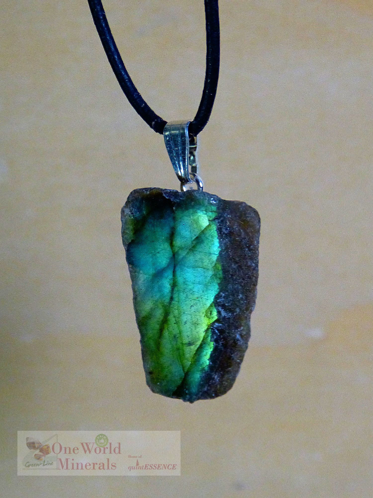 Die Vorderseite ist handpoliert, die Rückseite roh belassen. Der Anhänger kann beidseitig getragen werden.