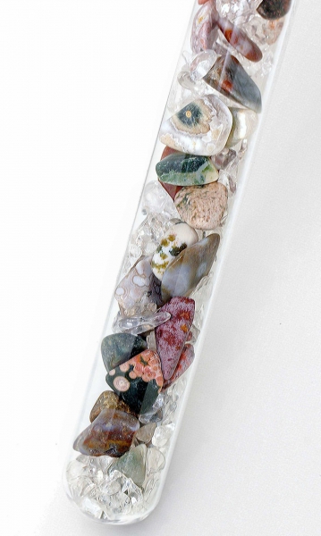 Mit Ozeanchalcedon & Bergkristall. Die Steinheilkunde spricht dem Ozeanchalcedon viele Eigenschaften zu, u.a. Lebenskraft, Hoffnung, Erneuerung. Der Bergkristall kann, wie in fast allen unserer Wasserstäbe, diese Wirkungen sanft unterstützen.*