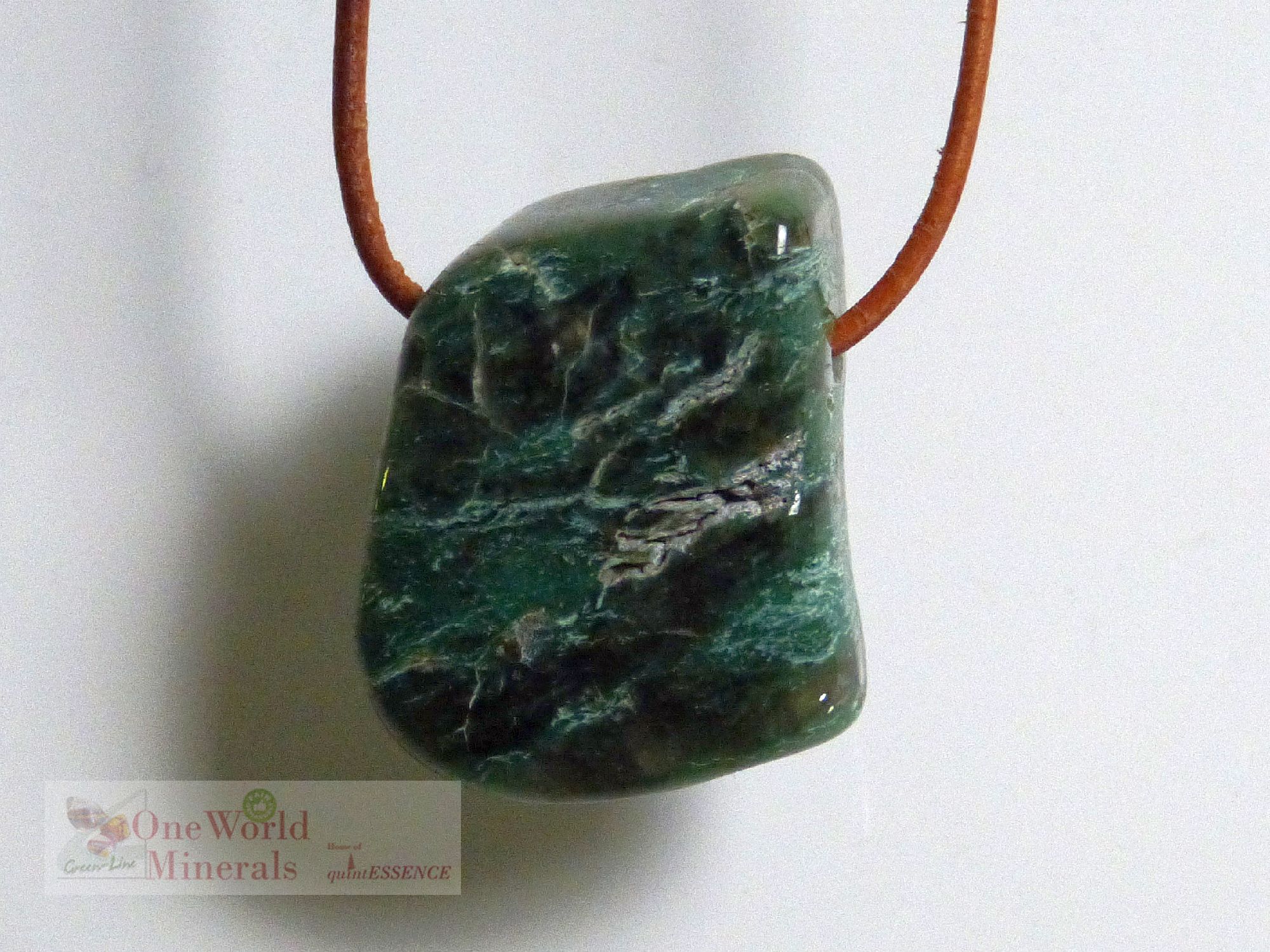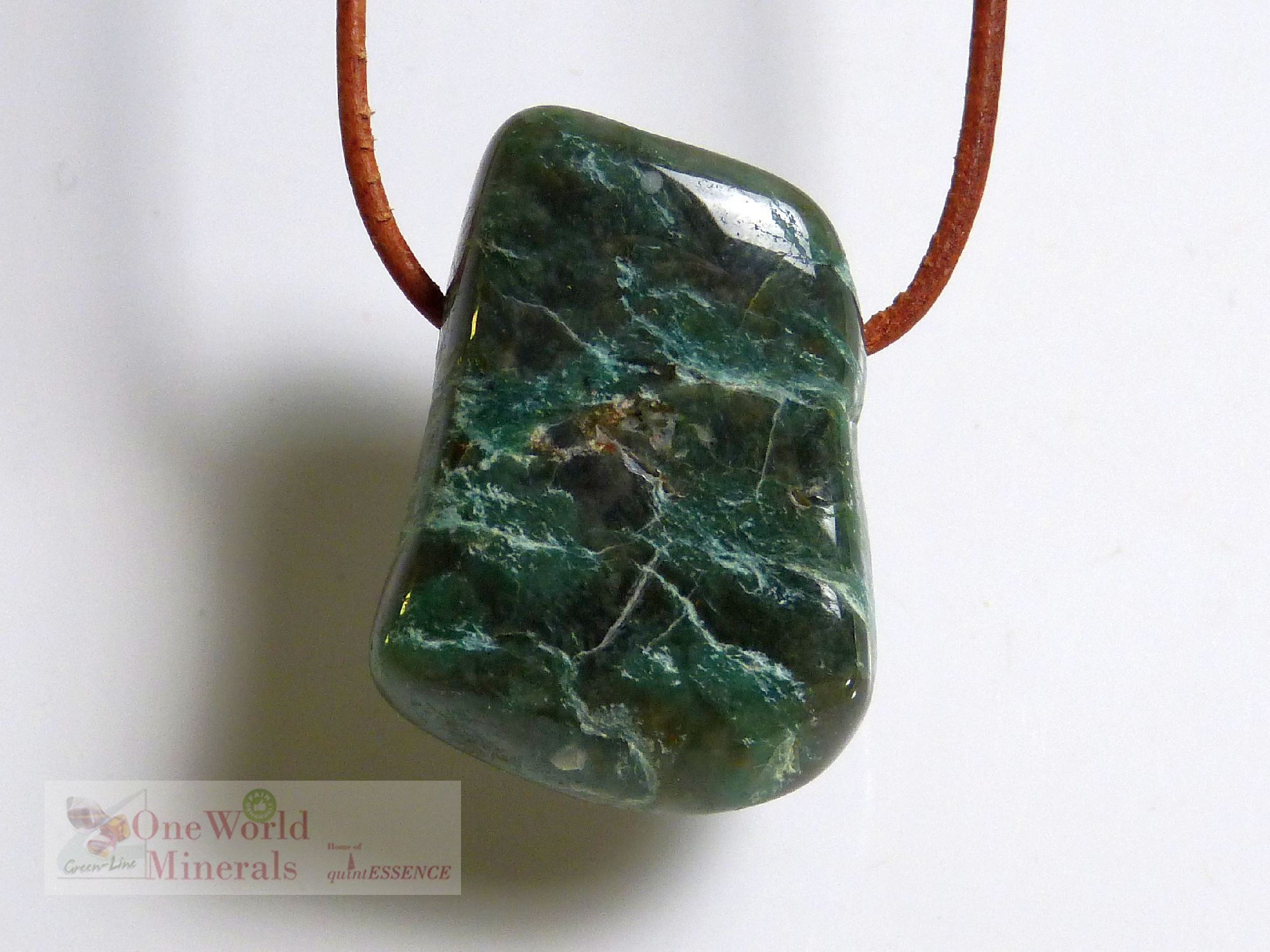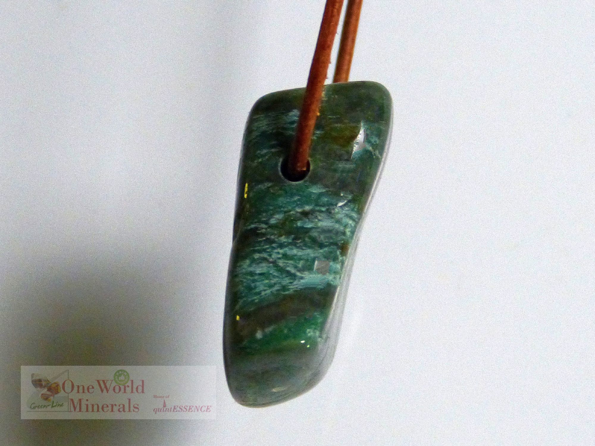 Dunkelgrüner, intensiver Fuchsit-Quarz Anhänger. Der Anhänger ist ca. 3 x 2 cm groß und kann beidseitig getragen werden.